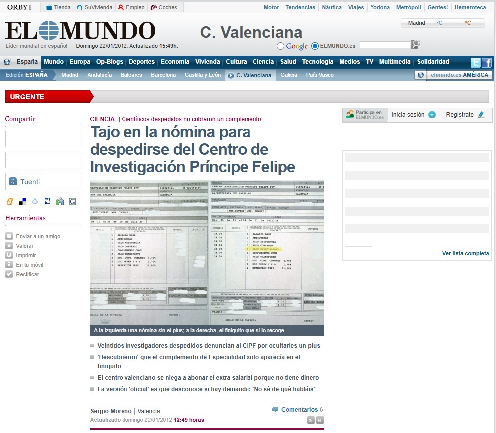 El diario El Mundo recoge la denuncia presentada por 22 investigadores contra el Centro de Investigación Príncipe Felipe (CIPF) por la ocultación sistemática del complemento salarial de Especialidad, reconocido por convenio. La reclamación fue impulsada legalmente por el abogado Salvador Pérez, desde el despacho Carrascosa & Pérez, al detectar que el plus únicamente se reflejaba en el finiquito, pero no en las nóminas anteriores. La dirección del centro se negó inicialmente a abonar los atrasos alegando falta de fondos. El caso evidenció un incumplimiento grave de los derechos laborales en el ámbito público-científico.
