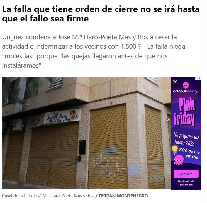 El diario Levante-EMV recoge la polémica surgida tras una sentencia que ordena el cese de actividad y desalojo del casal fallero José M.ª Haro–Poeta Mas y Ros por molestias acústicas. El despacho Carrascosa & Pérez Abogados, con participación de Salvador Pérez, lideró la defensa vecinal, logrando que se reconociera judicialmente la vulneración del derecho al descanso en un caso que generó un debate social sobre el uso de los casales en entornos residenciales.