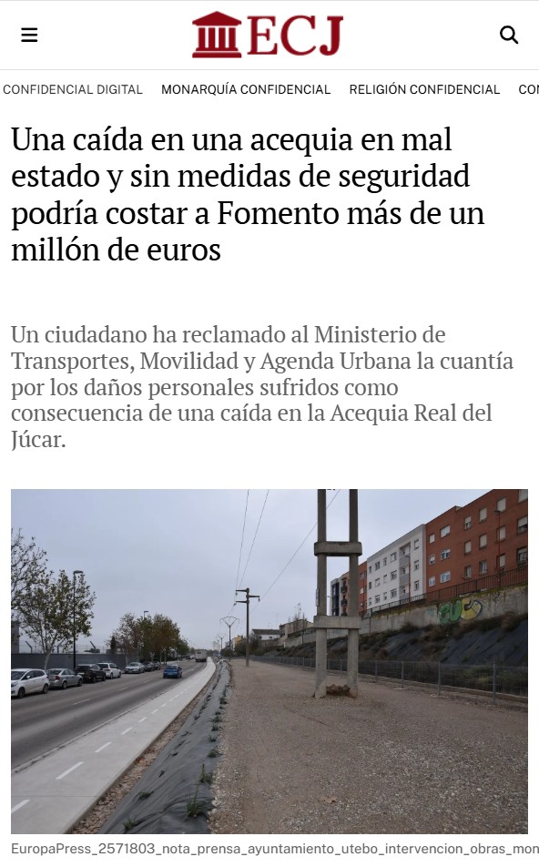 El Confidencial Digital informa sobre un proceso judicial por la caída de una persona en una acequia en mal estado, lo que podría acarrear una importante indemnización a la administración. Salvador Pérez, como abogado del caso, defiende los derechos del afectado y subraya la falta de medidas de seguridad.