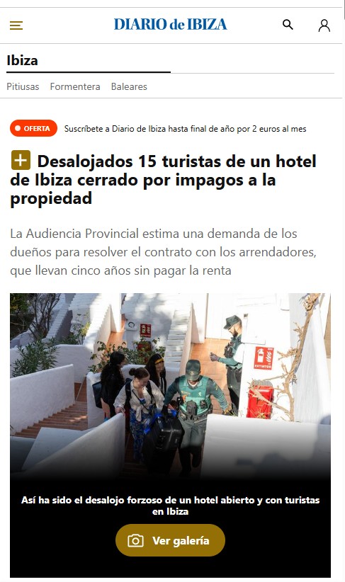 El Diario de Ibiza publica el desalojo forzoso del hotel Casa Victoria Suites por impagos reiterados, tras cinco años de litigios. El caso fue representado por el despacho Las Ciencias Abogados, en defensa de la propiedad del inmueble.