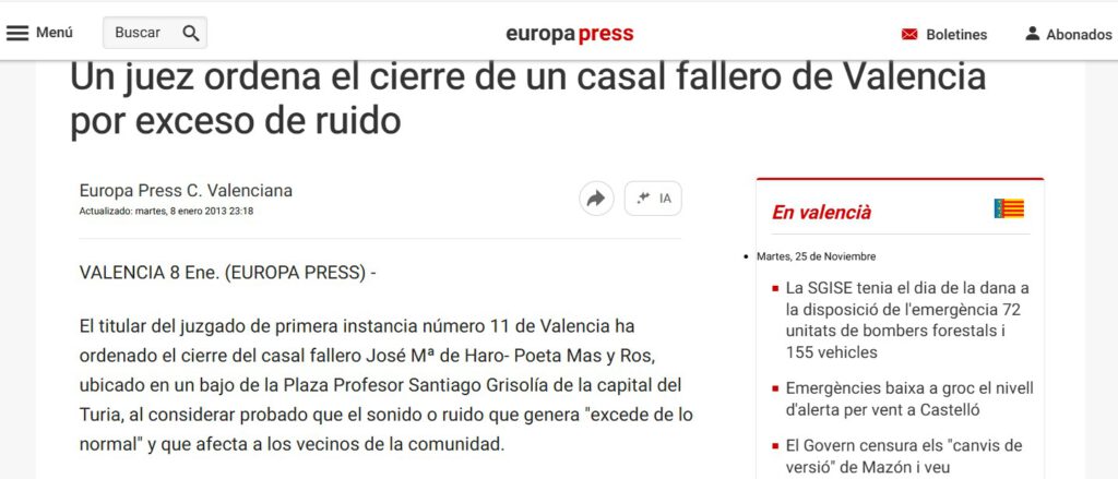 Europa Press informa sobre una resolución judicial que ordena el cierre de un casal fallero en Valencia por exceso de ruido, tras la demanda presentada por los vecinos. Salvador Pérez actuó como abogado en el procedimiento.