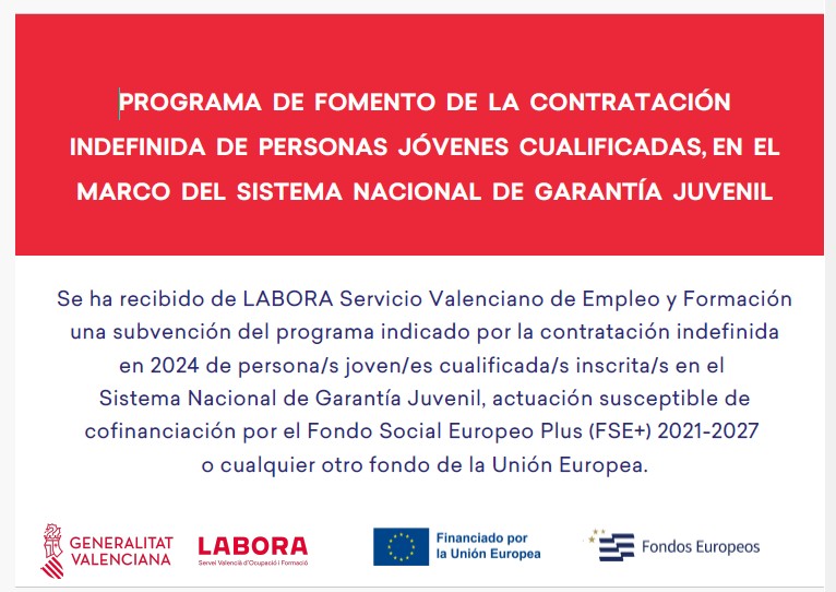 Las Ciencias Abogados ha obtenido de LABORA – Servicio Valenciano de Empleo y Formación una subvención correspondiente a la contratación indefinida realizada en 2024 de persona(s) joven(s) cualificada(s) inscrita(s) en el Sistema Nacional de Garantía Juvenil, actuación susceptible de cofinanciación por el Fondo Social Europeo Plus (FSE+) 2021-2027.
